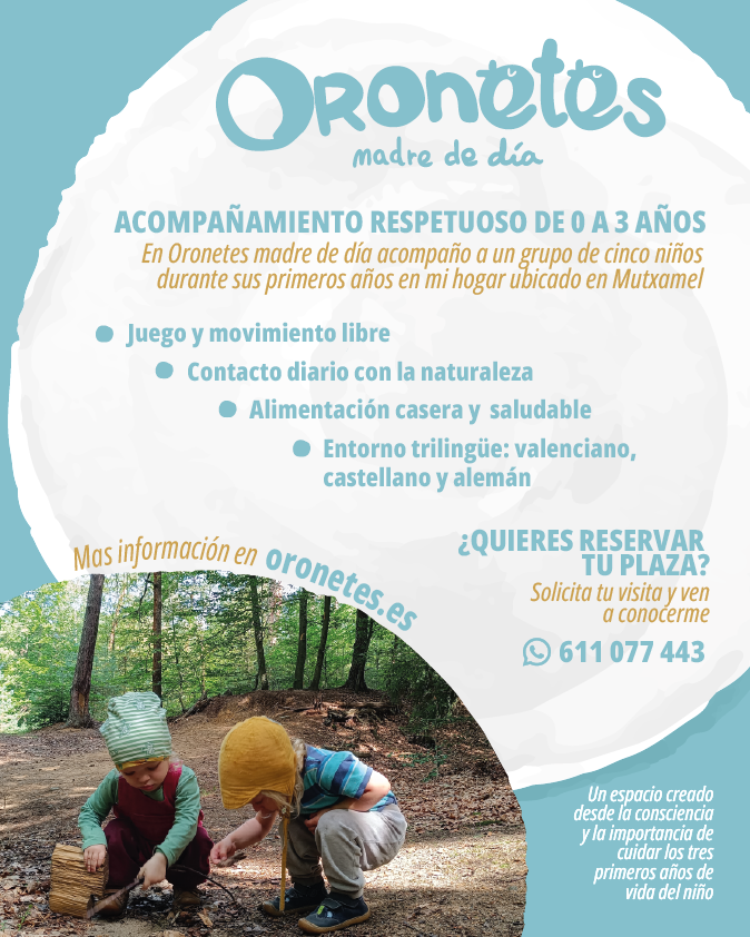 Una alternativa a la escuela infantil tradicional, cercana y personalizada. En Oronetes madre de día acompaño a un grupo de cinco niños durante sus primeros años en mi hogar ubicado en Mutxamel. El ambiente familiar y cálido cuidadosamente preparado invita al juego, la experimentación, el movimiento libre y al contacto con la naturaleza diariamente. Atiendo a las necesidades de cada niño y de forma individualizada, con presencia afectiva y profesional, y respetando su ritmo natural de desarrollo.